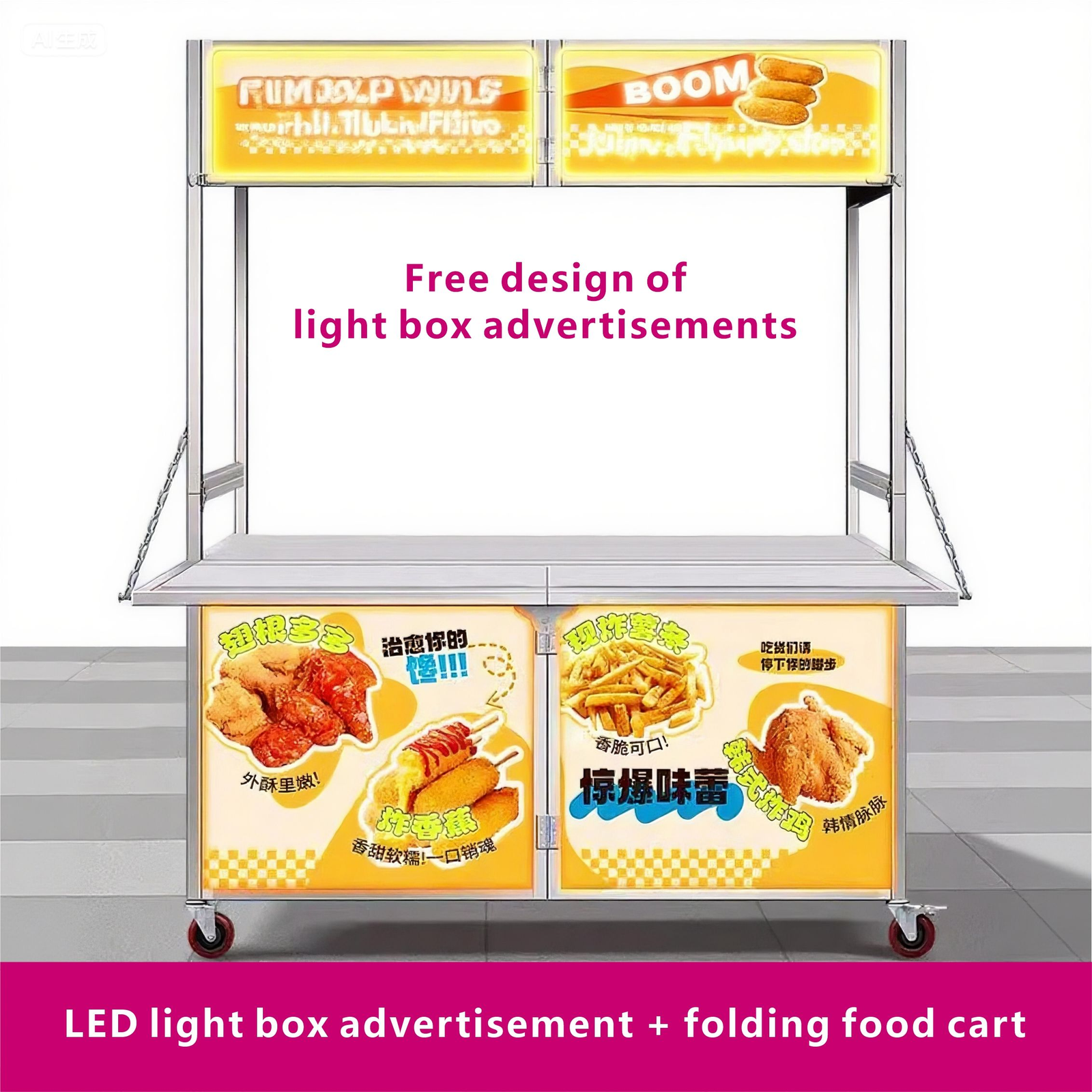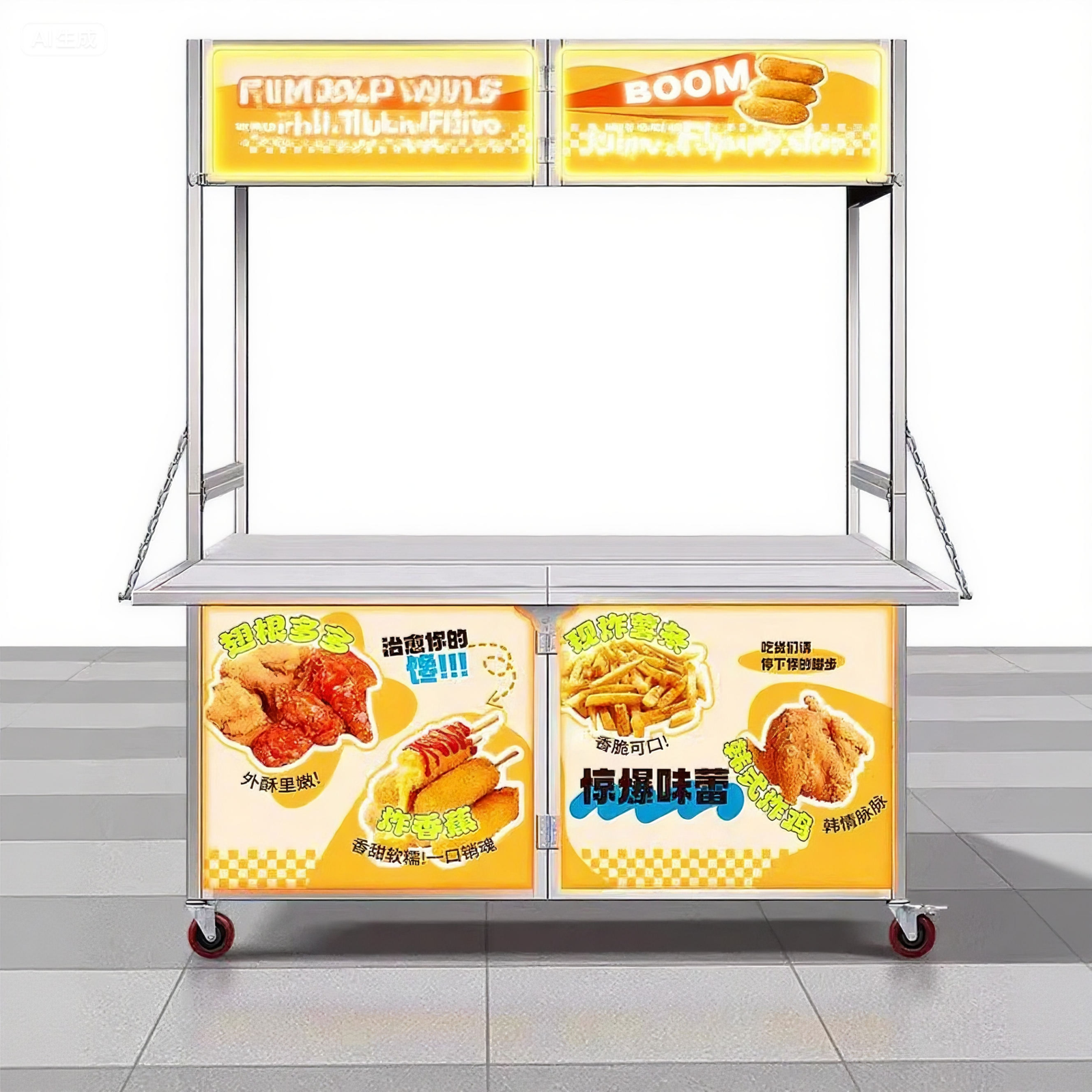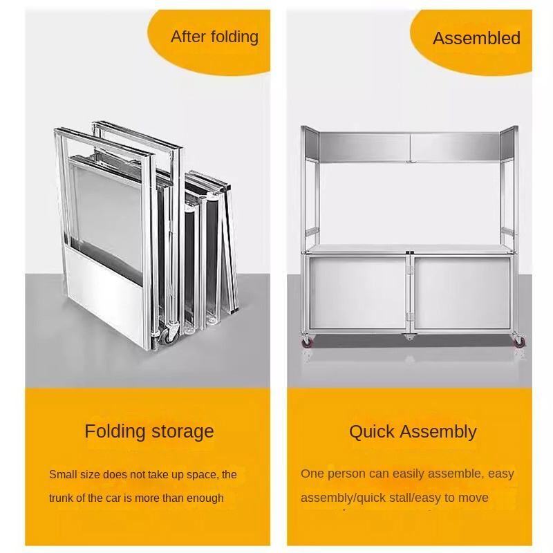 The foldable food cart easily folds flat for quick storage and transport, making it perfect for vendors on the move, small kitchens, and limited storage spaces.